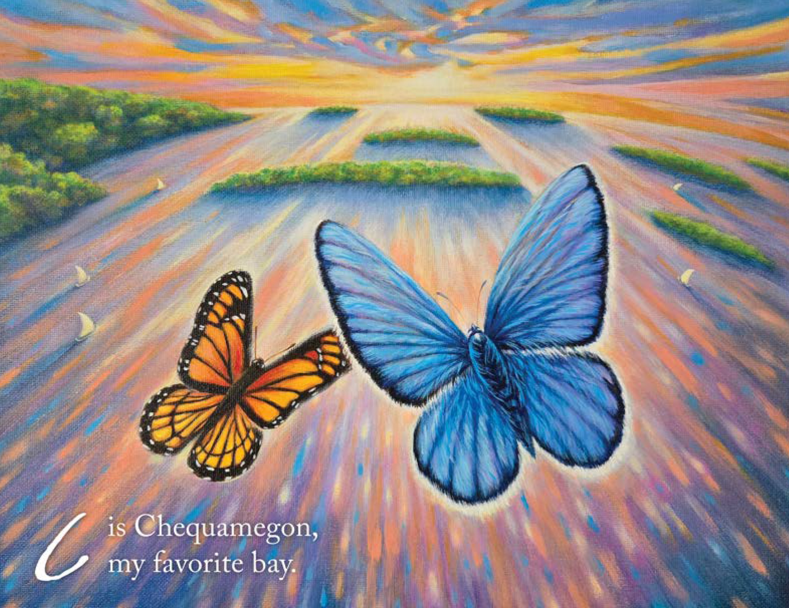The text also employs plenty of learning. Science with plants and animals and the use of terms like “estuary”. The weather on the lake includes wind, waves, fog, and all four seasons. Geography with the map of Lake Superior—the wolf’s head facing west, plus including Canadian places and scenes. Lake Superior is more than the United States side. History with V for voyageurs, and the French spelling to boot. And, of course, letters and sounds. The letter x is always hard, because so few words actually have the “ks” sound at the beginning. Most alphabet books, including this, go with “x” in an “ex” word.
