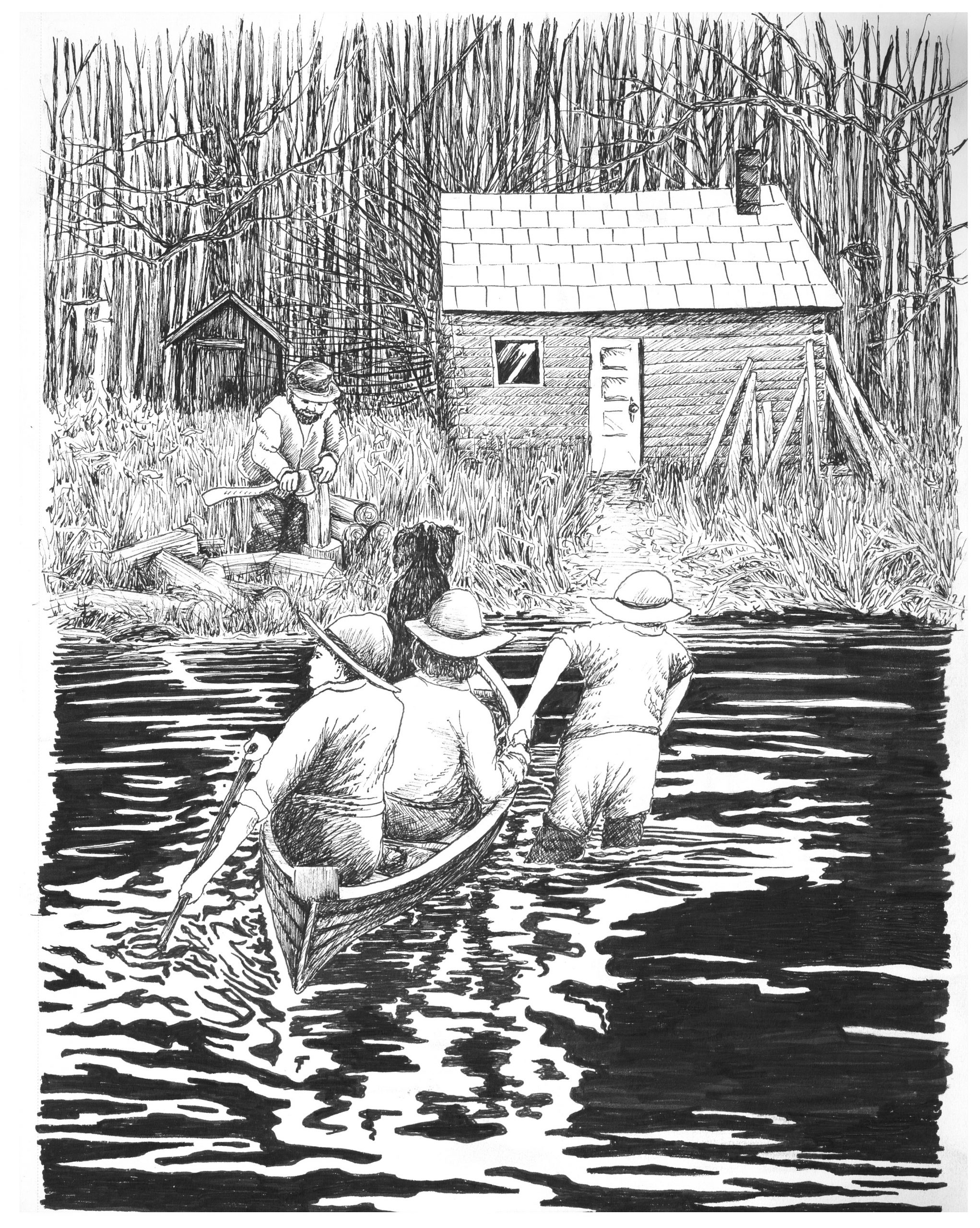 Houghton and explorers arrive at a trading post (Illus. by J. Walitalo)